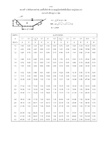 ตารางที่ 14 รศมีชลศาสตร (R) และพื้นที่หนาตัด (A) ของคูเปดหนาตัดสี่เหลี่ยมคางหมูไม่สมมาตร