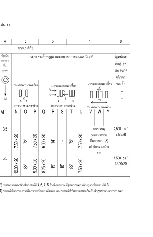 (3) ความดนยางสาหรบยางทกขนาดในสดมภที่ 8 ควรมีคาเทากับ 75 ปอนด / ตารางนิ้ว (4) ขนาดมิตแรกของยางคอความกวางยางทั้งหมด และขนาดมติทสองของยางคอเสนผาศูนยกลางจากขอบนอก